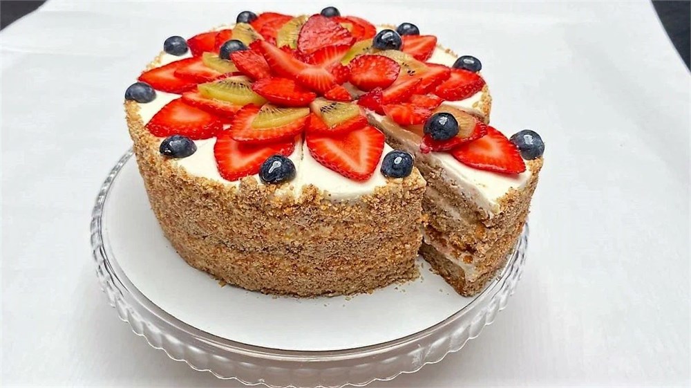 Бисквит ореховый, сливки, сливочный сыр, ягоды.